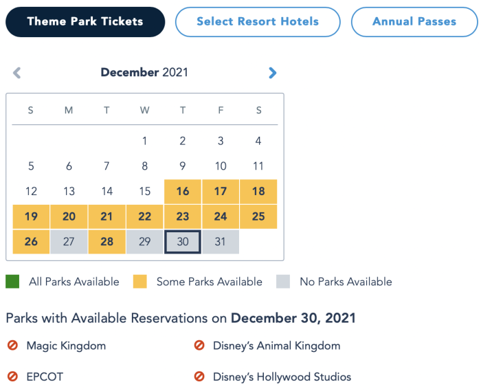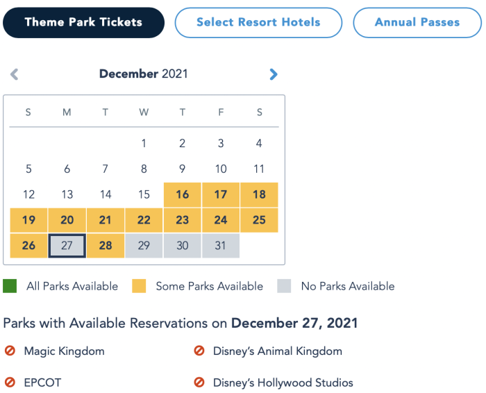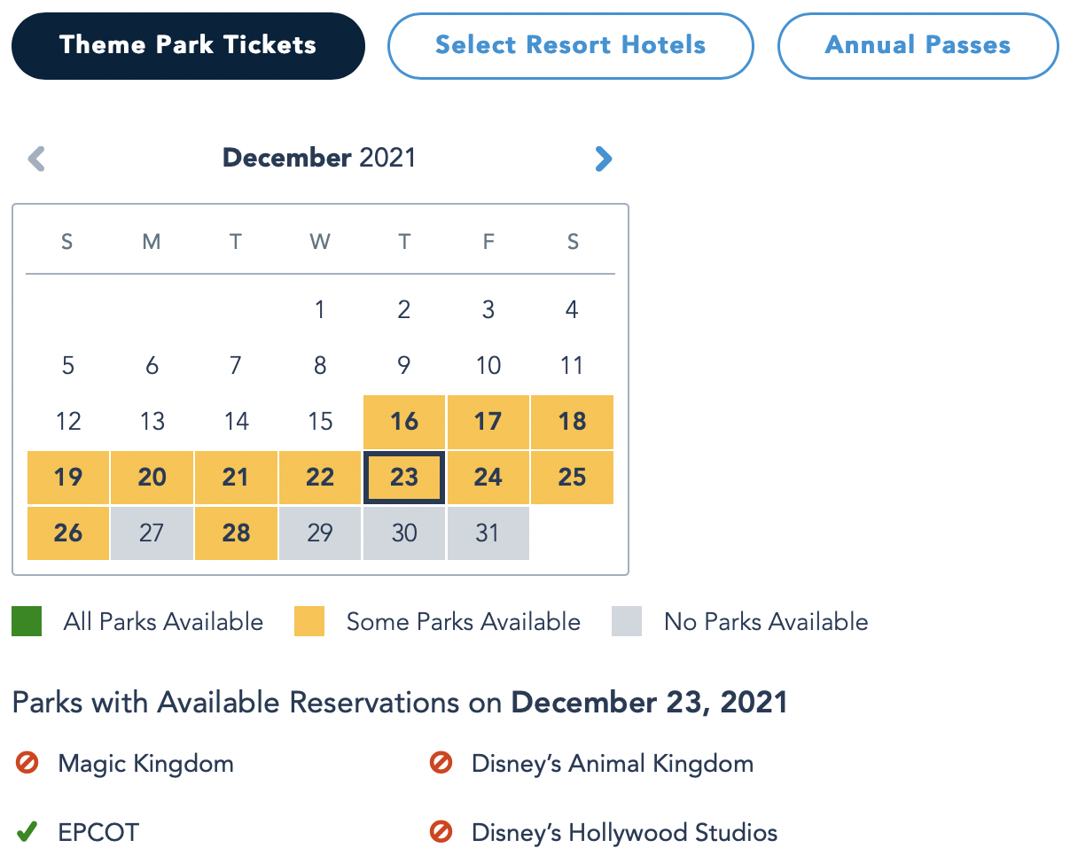 Interesting! We weren’t expecting the 18th to be the busiest day, but it makes sense, as it’s the Saturday before Christmas and people will probably be arriving into town for vacations. We wanted to compare these 5 busy travel days with how busy it’s projected to be in Disney World, so we took a look at the current park pass reservations still available. On December 18th, only Animal Kingdom and EPCOT are available.