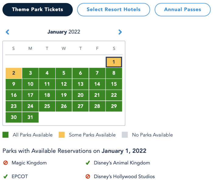 On January 1st — New Year’s Day — Animal Kingdom and EPCOT are also the only parks still available. It makes sense for the parks to be busy that day, as many people celebrate New Year’s in Disney Word. And, the airport will probably be busy because people will fly home after celebrating New Year’s Eve!
