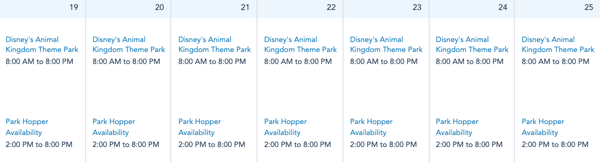 Disney’s Animal Kingdom will be open from 8AM-8PM daily next week.