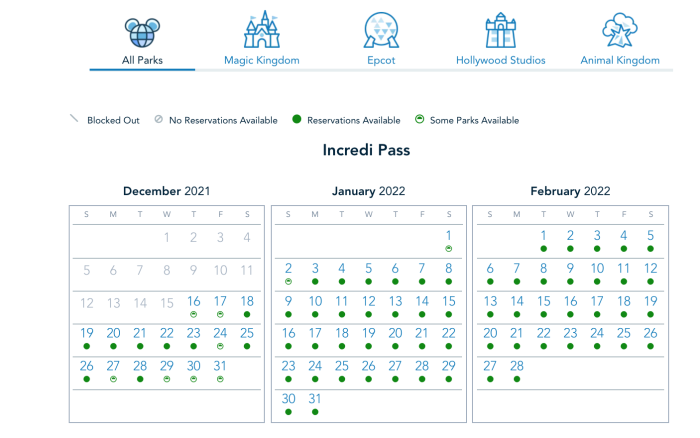 Current Disney Park Pass Reservation Availability the Week of December 19th