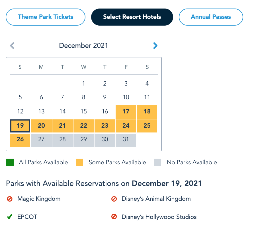 Select Resort Hotel Park Pass Reservation availability for December 19th as of December 17th © Disney