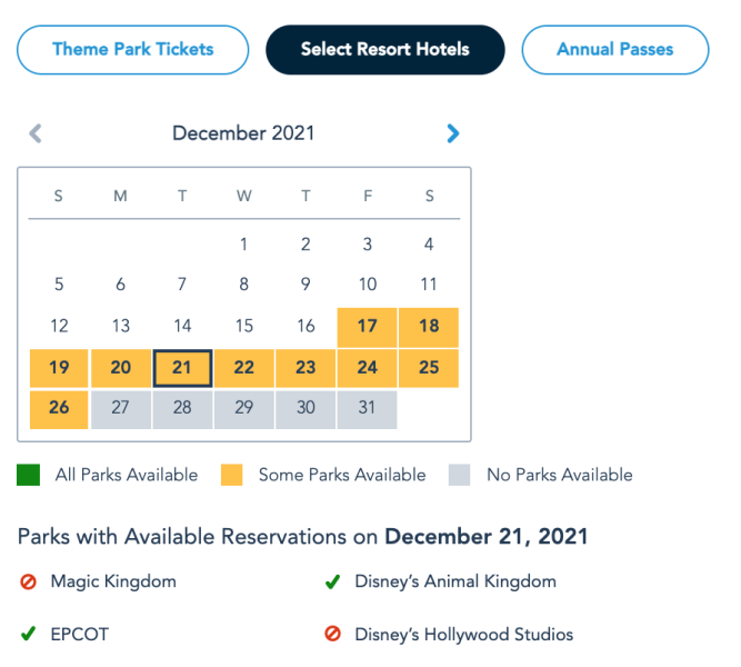 Select Resort Hotel Park Pass Reservation availability for December 21st as of December 17th © Disney