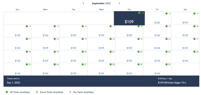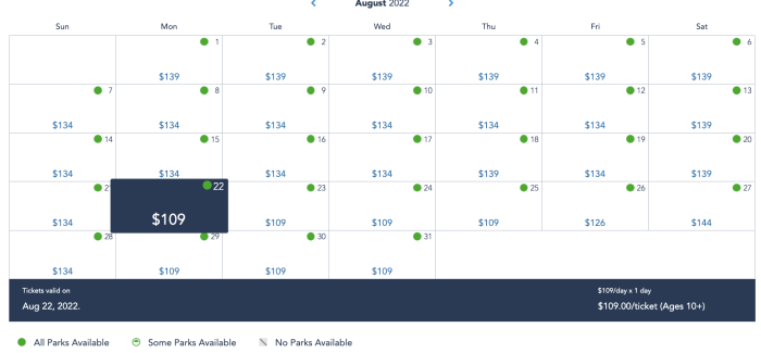 For 2022, we found some of the cheapest tickets (1 park per day, 1 day ticket — $109) near the end of August…