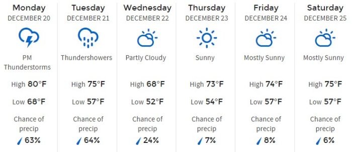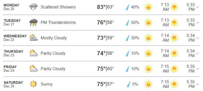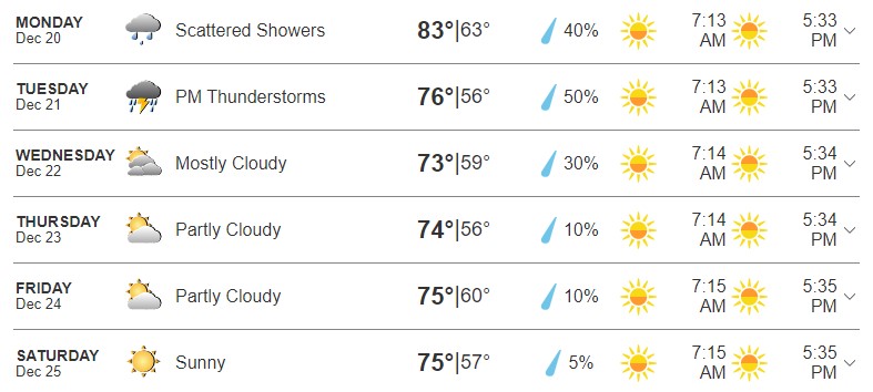 Monday, December 20th will bring us similar temperatures to the ones we saw last week with a liiiiittle step down to a 79 degree high. It looks like this week might be stepping us back into cooler temperatures — and into more rain.