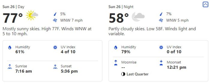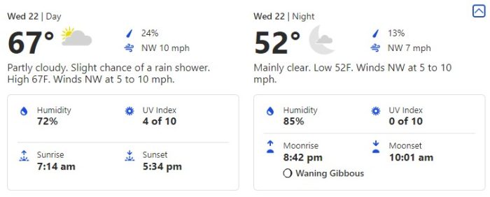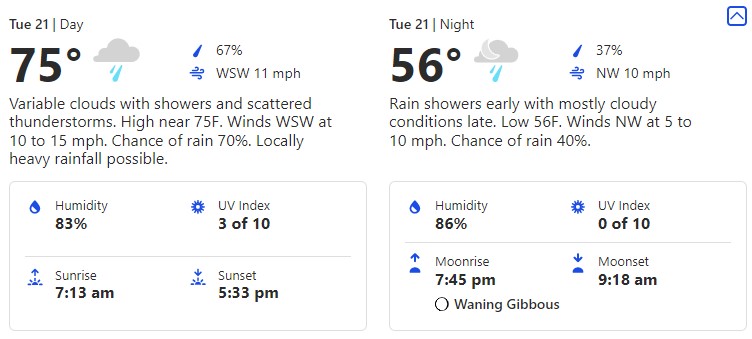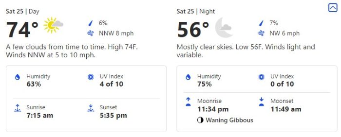 The week continues with similar temperatures to the day before on December 24th. Notice how large the change is between the day and night temperatures. That’s almost 20 degrees!