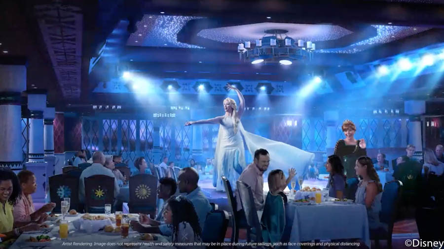 The restaurant is set with tables around a central stage, where you might see Elsa or Olaf performing for the party’s guests. There are other theatrical elements as well, like lights in the ceiling that “conjure Elsa’s icy magic” and panoramic windows that project the Aurora Borealis onto real-time ocean views.