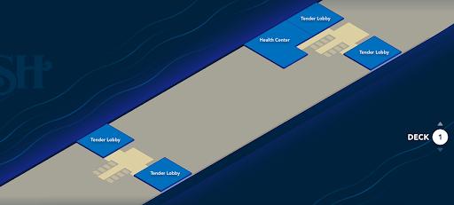 You probably won’t visit Deck 1 on your cruise, since the only things here are the Tender Lobbies and the Health Center. Tender Lobbies are where guests go to board smaller boats if the cruise ship can’t dock in a certain area.