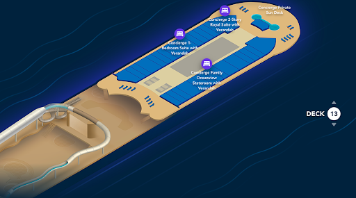 Along with more staterooms, Deck 13 has the private concierge deck (for guests staying at concierge staterooms and suites), the Quiet Cove, and the Cove Cafe.