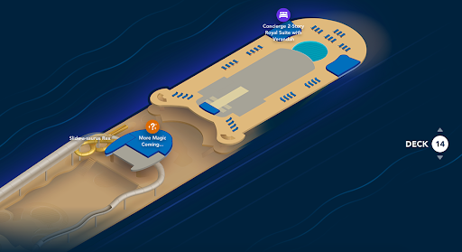 Hero Zone (which continues up to Deck 13 as well) is a place for the whole family. This space is for fun physical activities, like family obstacle courses and free-play sports hubs. There’s also room for game show-style competitions, and guests can choose to participate or watch and cheer on the participants. And finally, the Toy Story Splash Zone is where you’ll find Slide-a-saurus Rex (a water slide for kids), a wading pool, and a smoothie bar called Wheezy’s Freezies.