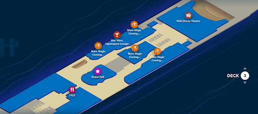 Deck 3 is home to the Grand Hall, the Star Wars Hyperspace Lounge, and the 1923 restaurant.