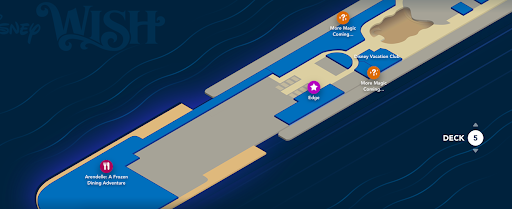 Besides a continuation of Luna, Deck 5 has a Disney Vacation Club spot, the Edge club for teens, Arendelle: a Frozen Dining Adventure…
