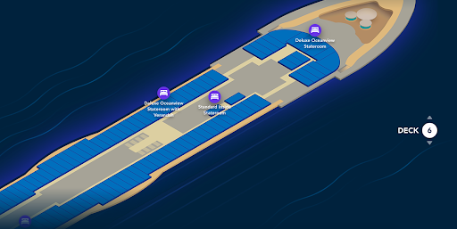 Deck 6 is the start of the staterooms, which take up all of Decks 6 through 10, with some staterooms on Decks 11 through 14 as well.