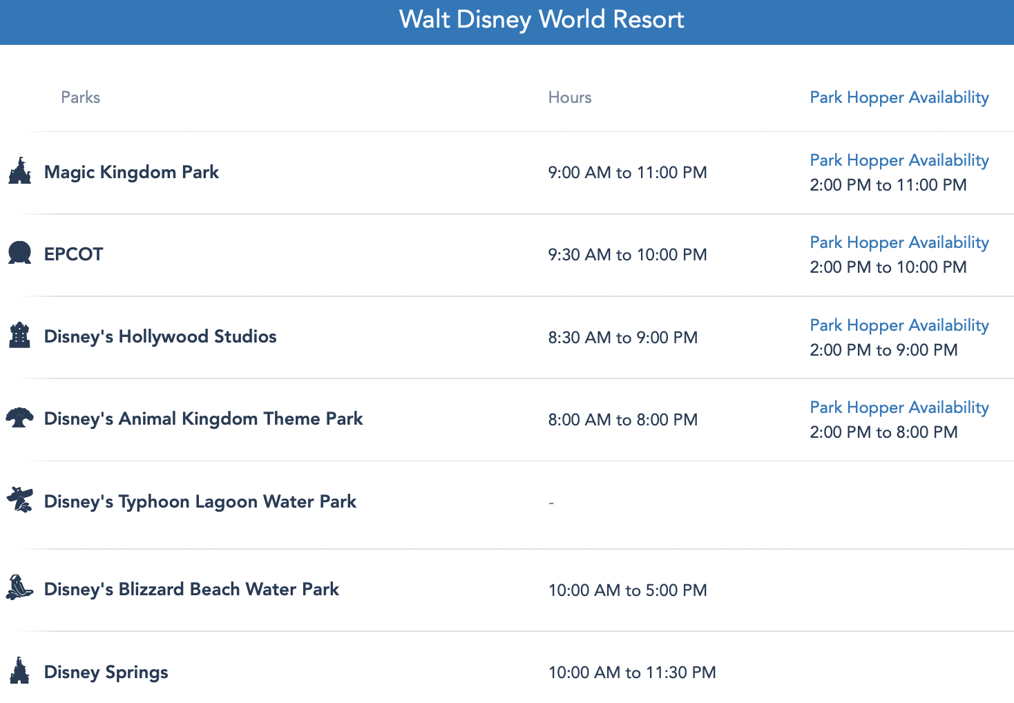 Disney’s Blizzard Beach Water Park is also open from 10AM to 5PM on Christmas Day, and Disney Springs is open from 10AM to 11:30PM.
