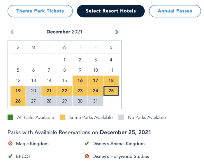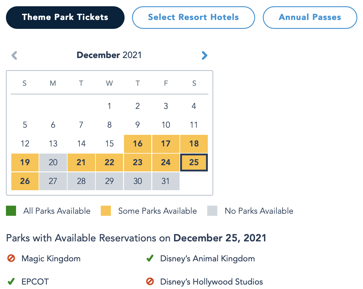 If you want an idea of just how busy it’s going to be, let’s take a look at park pass reservations. For regular theme park tickets, only EPCOT and Animal Kingdom still have park reservations available as of this writing, Magic Kingdom and Hollywood Studios are completely booked.