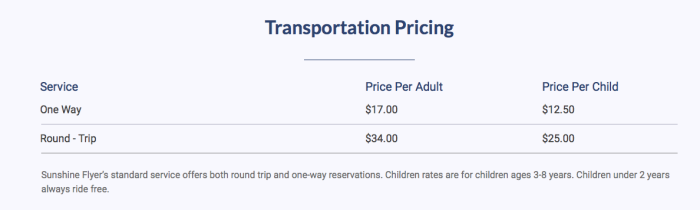 If you want to book a trip through The Sunshine Flyer, you must do so at least 4 days ahead of your arrival. Tickets are priced at $17 per adult and $12.50 per child for a 1-way trip. Round trip is $34 for adults and $25 per child. Kids under 2 ride free.