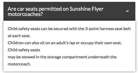 In terms of car seats, the website notes that car seats are permitted on the motor coach.