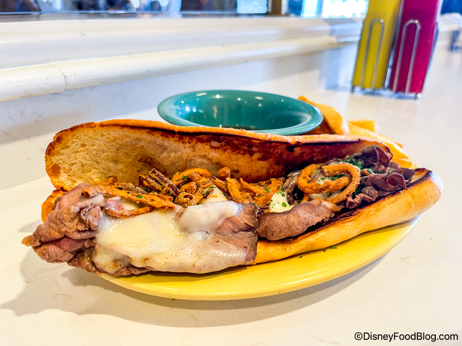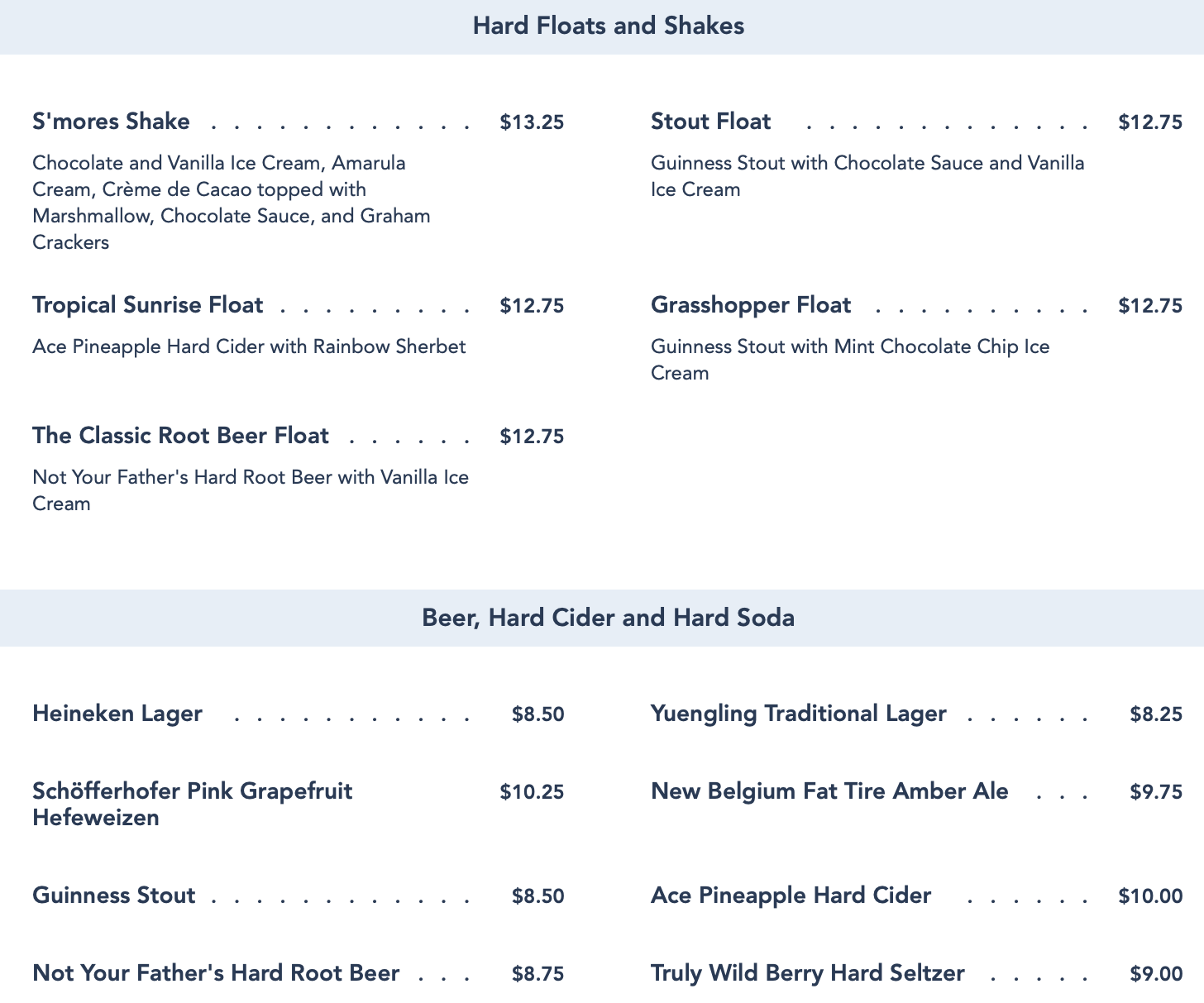 …Beaches and Cream doesn’t have a huge menu right now, but there are some good options! They’re open for lunch and dinner, but both meals have the same menu. For entrees, you can get things like a classic Angus Beef Burger or the Cheddar-Bacon-Ranch Chicken Sandwich. BTW, check the prices. There’s pretty great, right? (Well, OK, by Disney standards, at least!). A fresh-made sandwich or burger for around $15 in Disney World at a sit-down restaurant is a score!