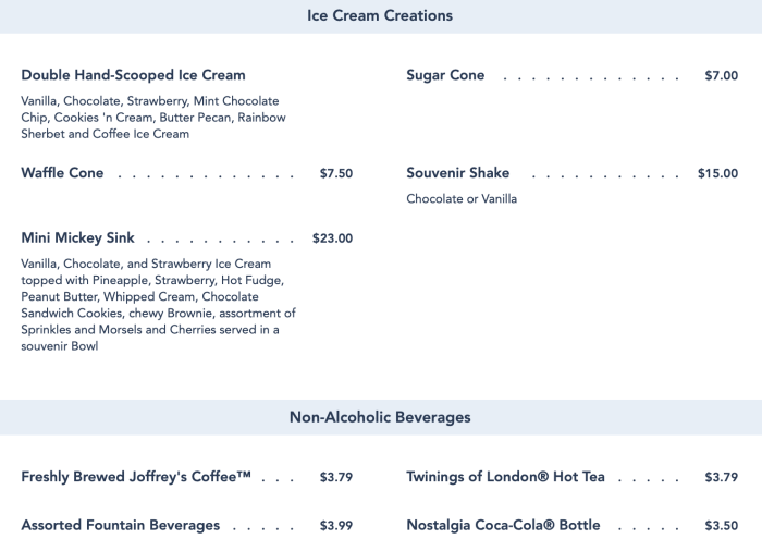 There are also some simpler Ice Cream Creations like a scoop in a waffle cone or a Mini Mickey Sink! And, you can get regular beverages here like coffee, soda, and tea.