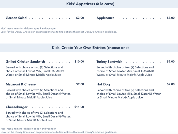 The kids’ create-your-own entrees come with 2 sides. They can get things like Watermelon, Carrots, or a Mickey Mouse Sundae.