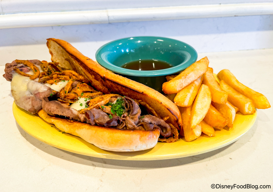 Now, moving on to the French Dip Sandwich! This is a toasted French roll served with thinly-sliced roast beef, Swiss, and au jus topped with crispy fried onions. We also got a side of French fries.