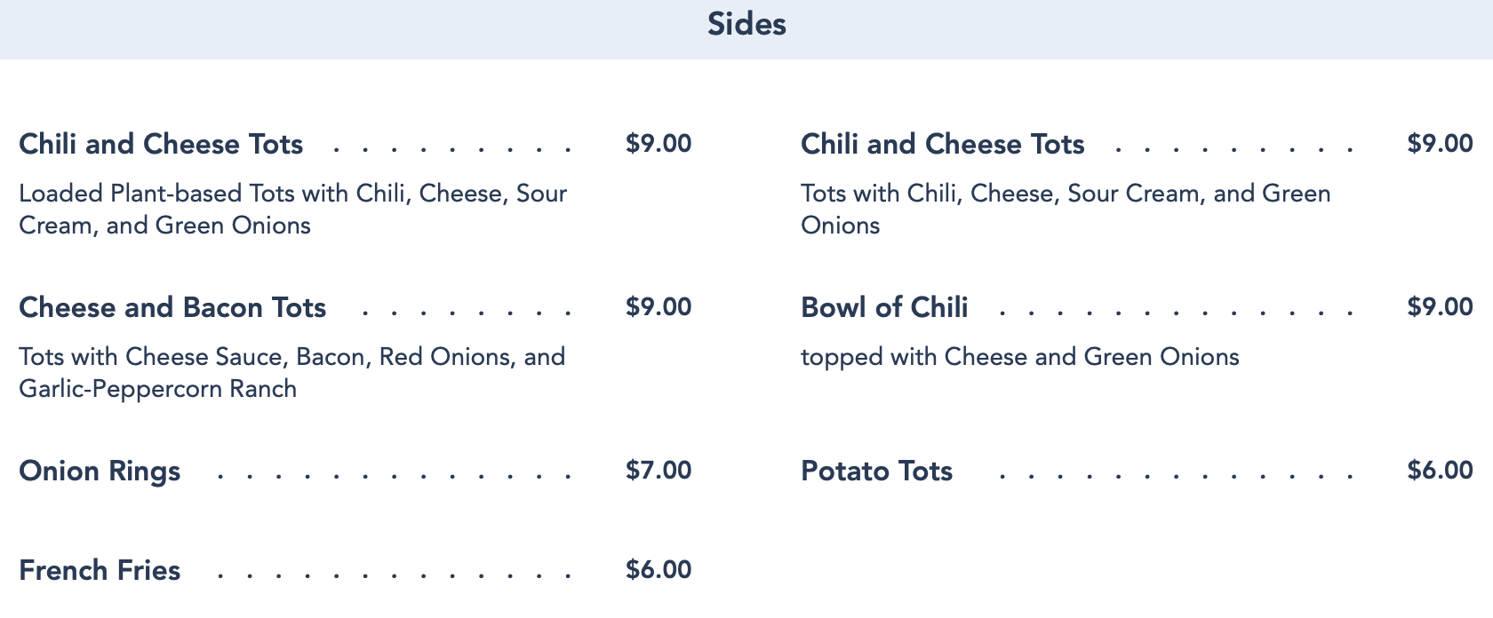 For sides, there are things like Chili and Cheese Tots, Onion Rings, and a Bowl of Chili.