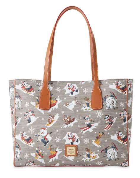 This holiday print features Mickey, Minnie, Donald, Goofy, Pluto, and Chip ‘n Dale in a bunch of snowy scenes, and the bag has a magnetic closure, pockets, and stitched leather finishings.