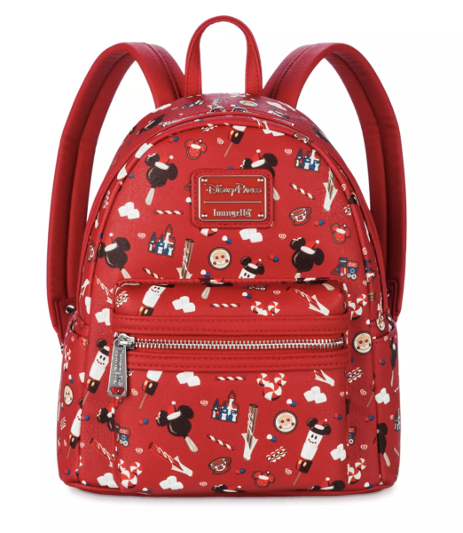 This mini Loungefly backpack is read with a holiday treat pattern featuring Mickey ice cream, Fantasyland Castle cookies, churros, peppermints, and more.