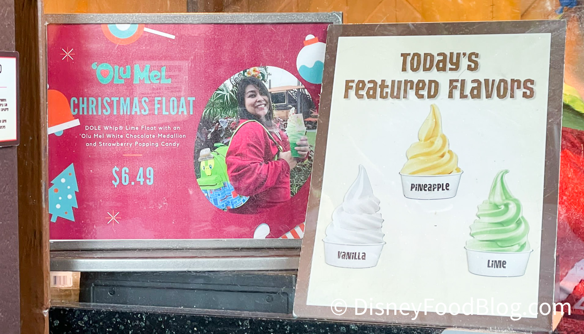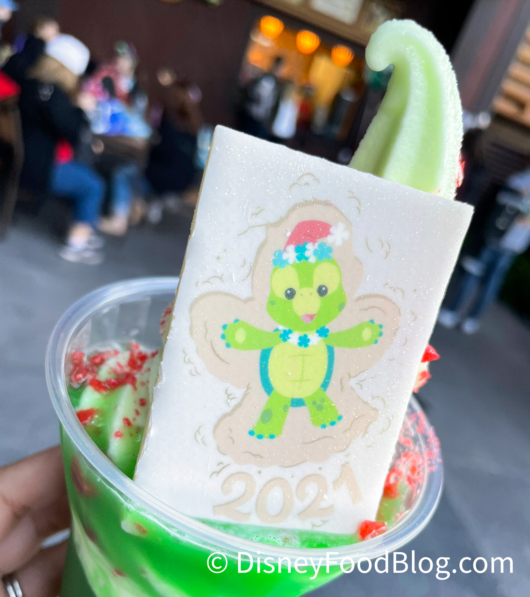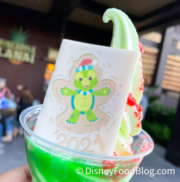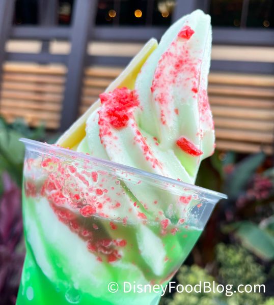 If you’re like us and are thinking, “WOW that is a very green Lime Dole Whip,” that’s because they added green food dye (probably to give it that extra pop of holiday color!). We personally could have done without the food dye, but it does make for a very cute, festive and colorful treat.
