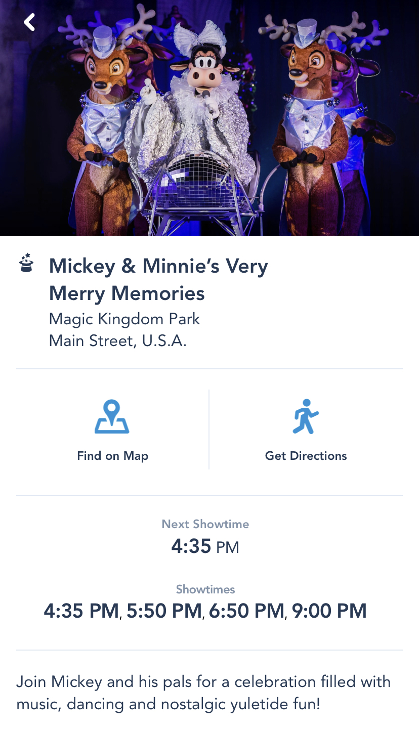 We’re not sure how long the show will be running at Magic Kingdom, as it’s not listed on the calendar. We had to actually search the show by name for it to pop up on My Disney Experience, so be aware if you’re looking for showtimes!