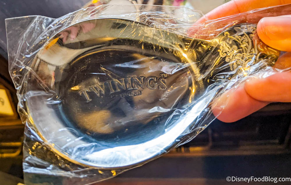 At the Tea Caddy in the UK pavilion of World Showcase, we found a new spoon rest that has the Twinings Tea logo on it.
