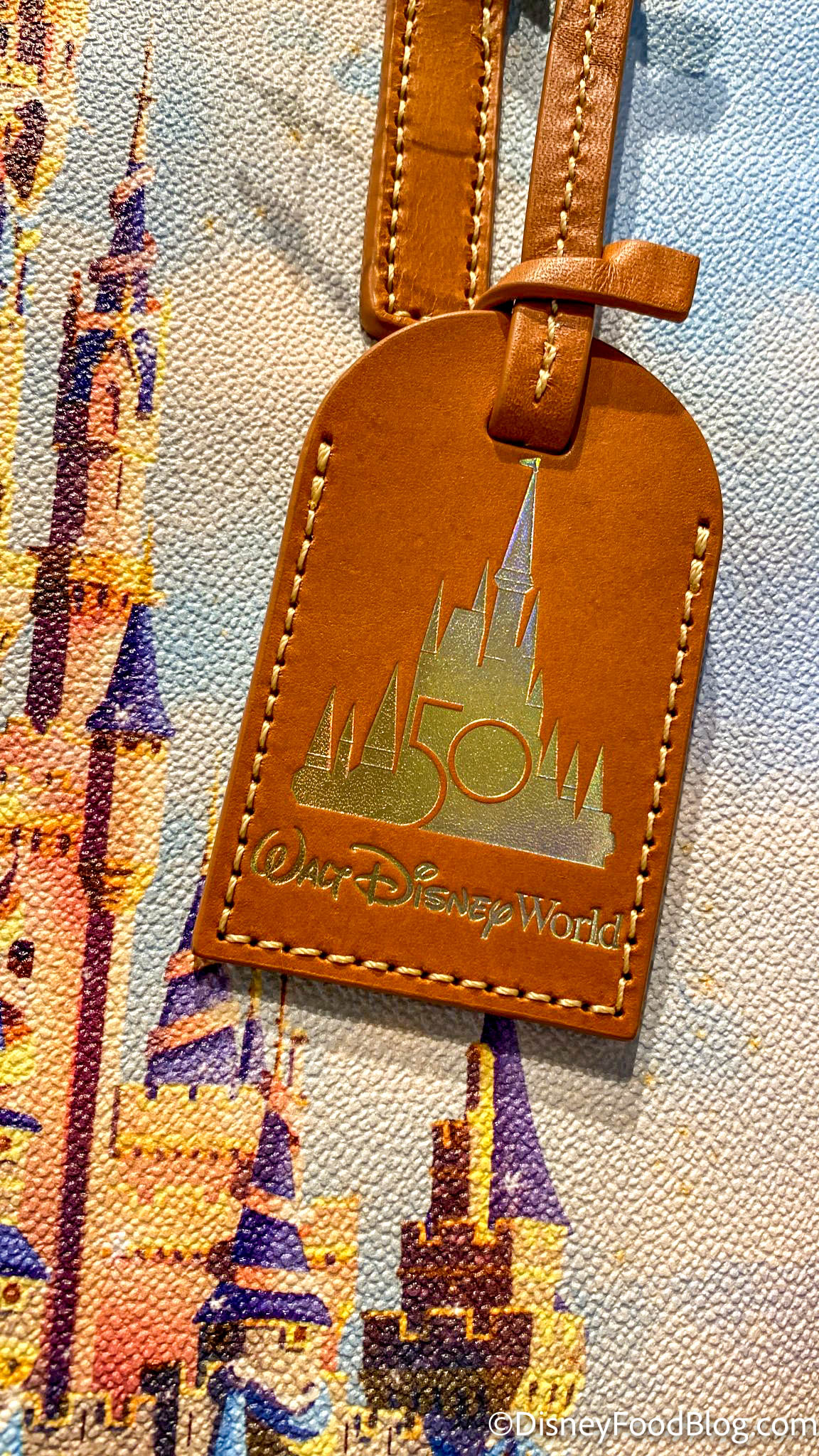 Each purse is outfitted with brown leather details, including a 50th logo Disney World tag.