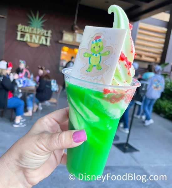Pineapple Lanai has a new Dole Whip creation! The ‘Olu Mel Christmas Float is a Dole Whip Lime Float with Pineapple Juice, an ‘Olu Mel White Chocolate Medallion, and Strawberry Popping Candy. It’s also covered in edible glitter!