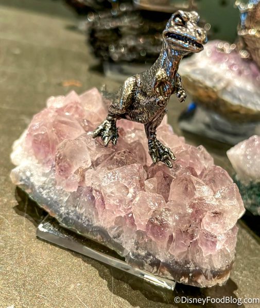 Chester & Hester’s Dinosaur Treasures in DinoLand U.S.A. had a new (or, at least, new to us) Dinosaur Crystal for $19.95. You can get your very own silver dino perched on top of a crystal!