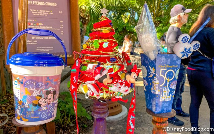 The shiny Christmas Tree Popcorn Buckets were back in stock during one of our recent visits to Animal Kingdom! These buckets are $25 and we found them somewhat hidden at The Feeding Ground at Discovery Island, and Corn-Ivores in Dino-Land U.S.A.