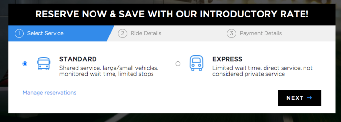 The Sunshine Flyer only offers its standard service. Their website notes that guests will not wait more than 20 minutes to board their bus once they enter the “staging area” at the airport. The ride to the resorts on these buses is set up so that the “last stop will not take more than 65 minutes.”