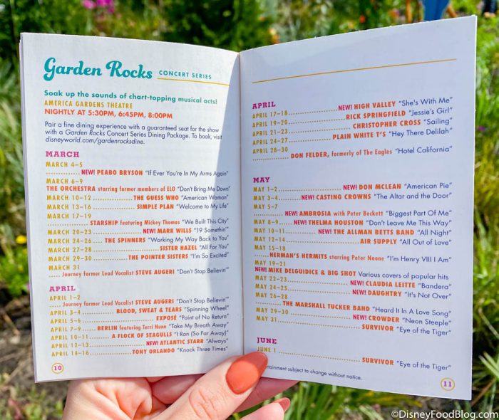The Garden Rocks Concerts Series is a nightly show that generally takes place three times per evening during the Flower & Garden Festival, at 5:30PM, 6:45PM, and 8PM. The concerts are free with your EPCOT admission and feature popular musicians performing at the American Gardens Theater in the American Adventure pavilion of EPCOT.