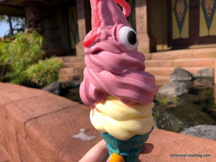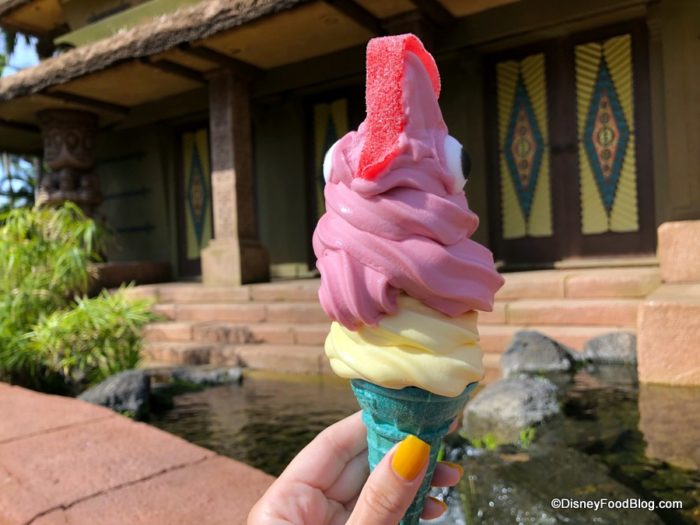 This lovely DOLE Whip creation first came on the scene at Aloha Isle in Magic Kingdom in February of 2019 (wow, that feels like a century ago). The version at Aloha Isle featured a blue cone, pineapple soft serve, raspberry soft serve, sugar “eye” pieces, and a sour candy “comb.” It looks like the version that will be served at Typhoon Lagoon will be very similar if not the same, but we’ll be sure to let you know if there’s been any changes. Seriously, just look at how Instagrammable it is!