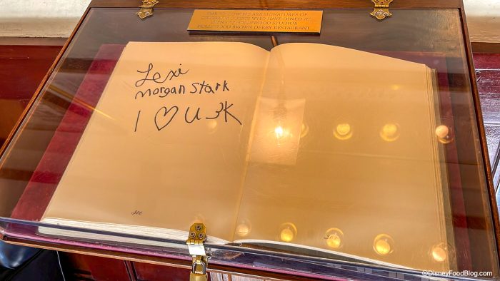 Finally, in a bit of wholesome news, we spotted an ADORABLE signature at the Hollywood Brown Derby: Lexi Rabe, who played Iron Man’s daughter Morgan Stark in Avengers: Endgame, signed the iconic book with her line “I love you 3000” at the end.