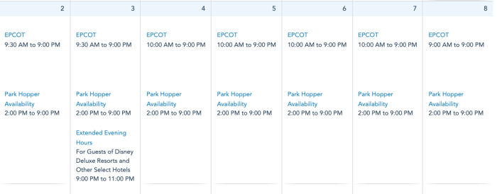 EPCOT will be open from 9:30AM-9PM Sunday and Monday, from 10AM-9PM Tuesday through Friday, and from 9AM-9PM on Saturday next week. On Monday, January 3rd, EPCOT will remain open for two additional hours for guests staying at Deluxe and Deluxe Villa Resorts.