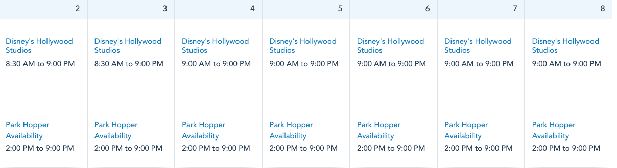 Disney’s Hollywood Studios will be open from 8:30AM-9PM Sunday and Monday, and from 9AM-9PM Tuesday through Saturday next week.