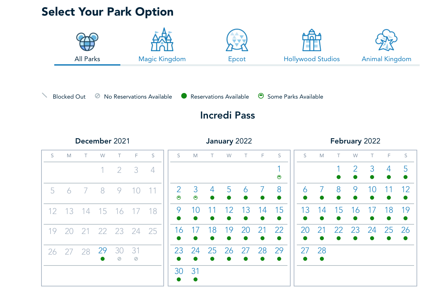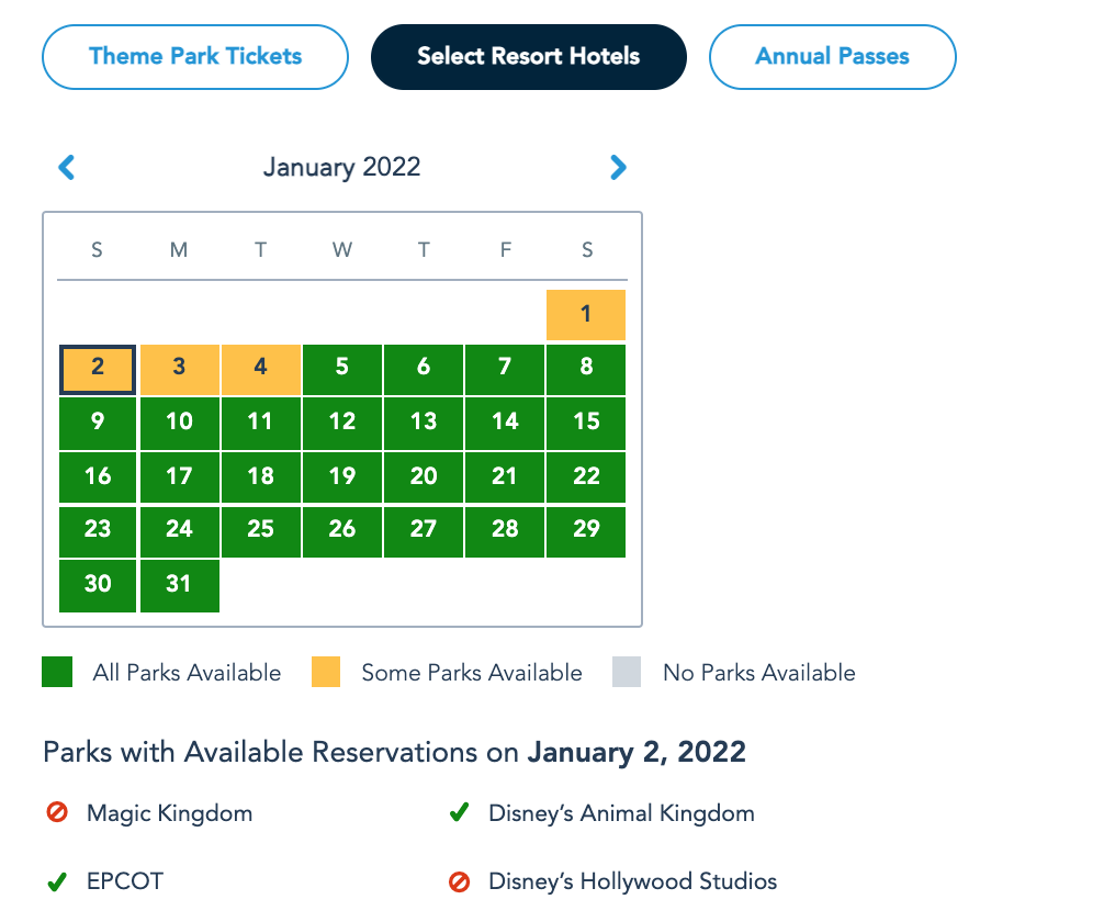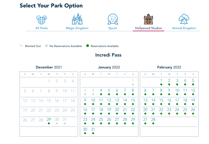 Current Disney Park Pass Reservation Availability the Week of January 2nd