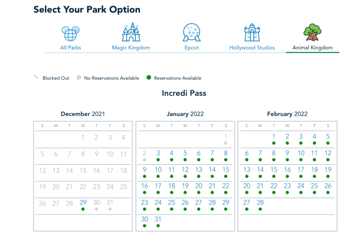 Annual Passholder Park Pass Reservation availability for the week of January 2nd as of December 30th at Disney’s Animal Kingdom © Disney