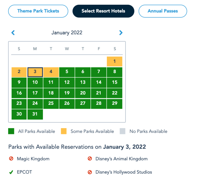For January 3rd, guests staying at Select Resort Hotels can book a Park Pass Reservation at EPCOT. From January 5th through 8th, all four parks have Park Pass Reservation availability as of this writing.