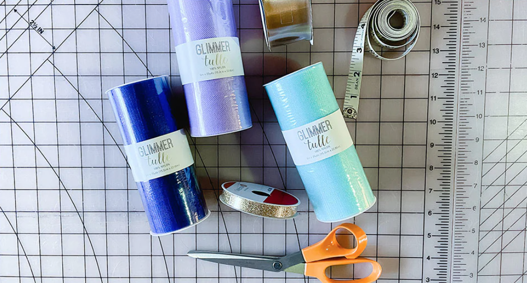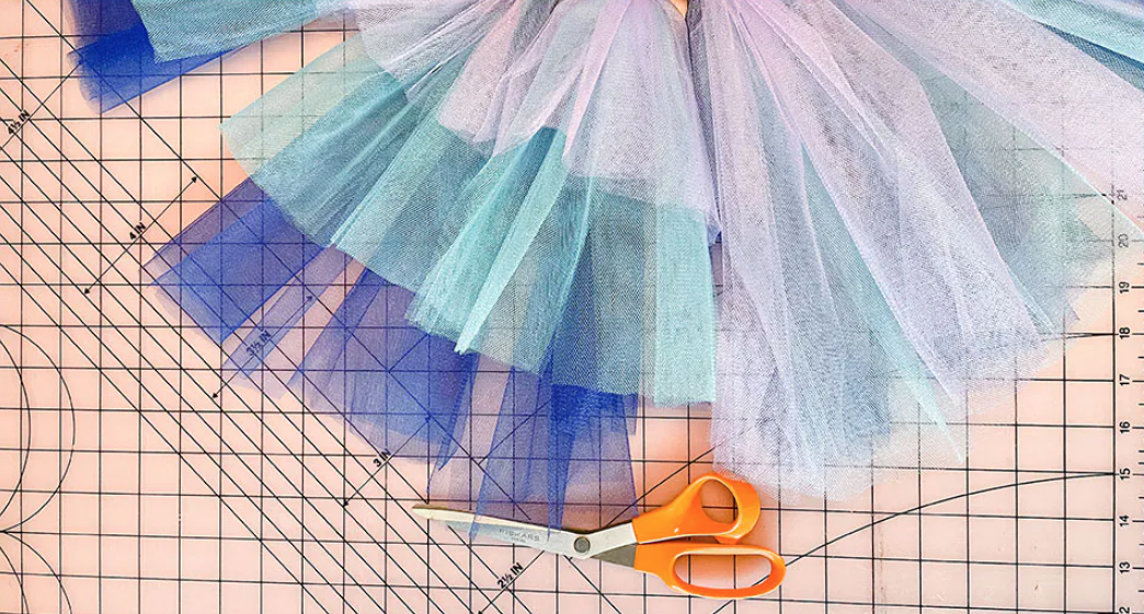 - Now, grab your tulle and begin cutting strips. Like, A LOT of strips. They should be 6 inches wide by however long you want the skirt to be. Repeat until you have a big ol’ pile of tulle!