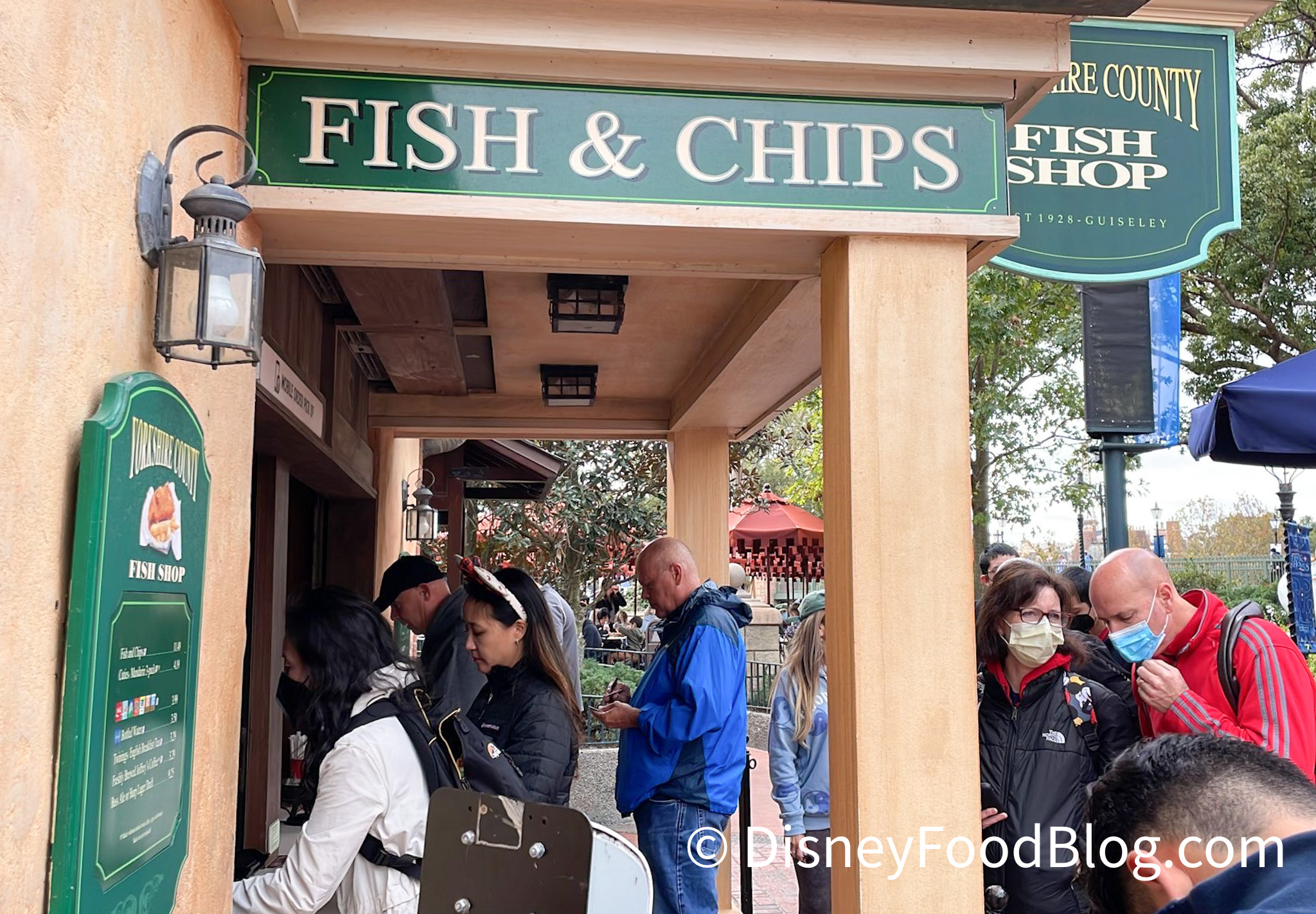 Yorkshire County Fish Shop only has a walk-up window with tables in the surrounding pavilion (this is a great spot if you want a waterfront view of World Showcase Lagoon!). You’ll find the shop to the right of Rose and Crown Pub closest to the International Gateway.