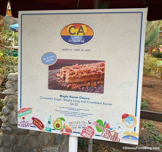 - Maple Bacon Churro: Cinnamon sugar, maple icing, and crumbled bacon (available with Sip & Savor Pass) – $6.25