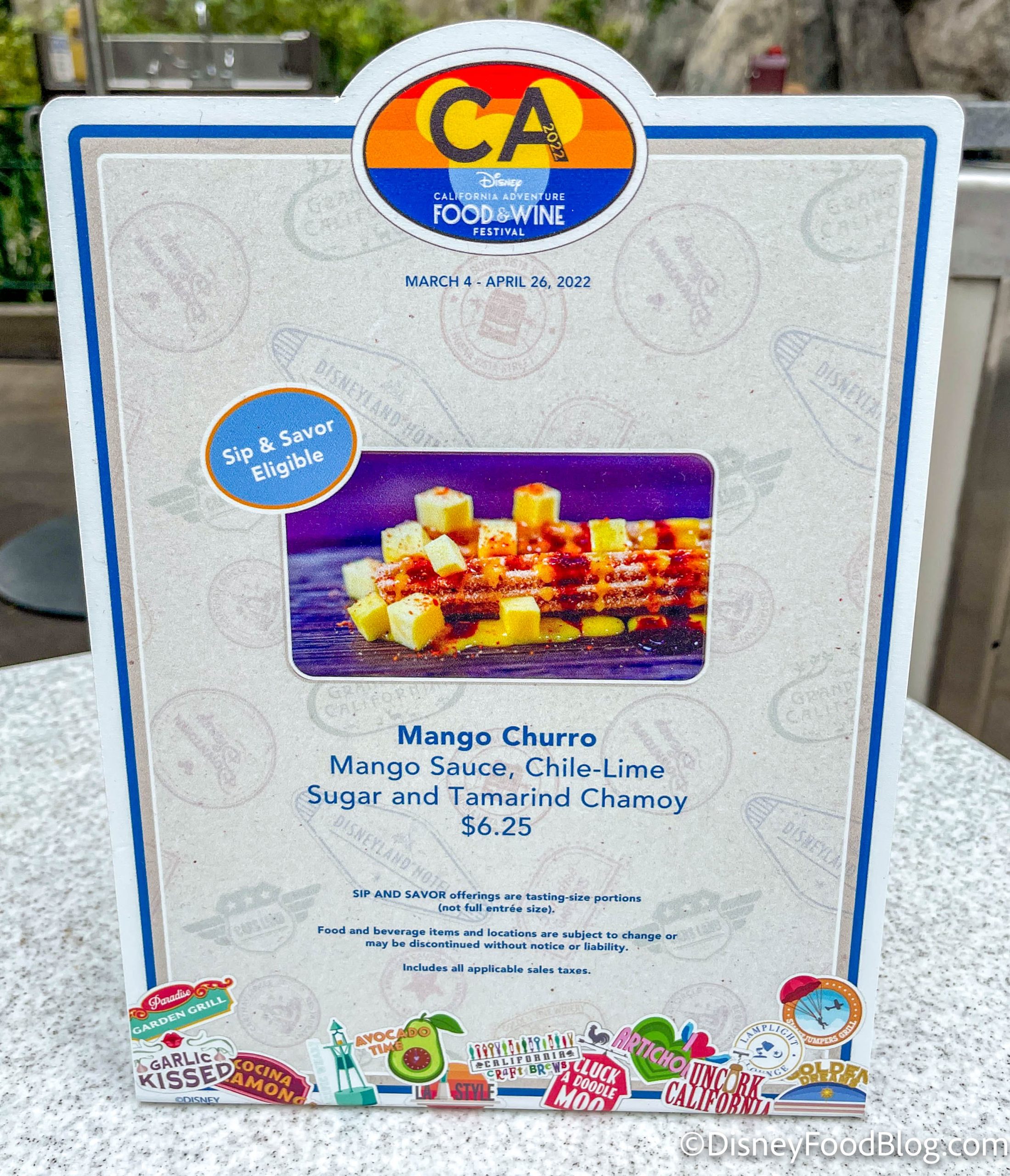 - Mango Churro: Mango sauce, chile-lime sugar, and tamarind chamoy (available with Sip & Savor Pass) (New) — $6.25