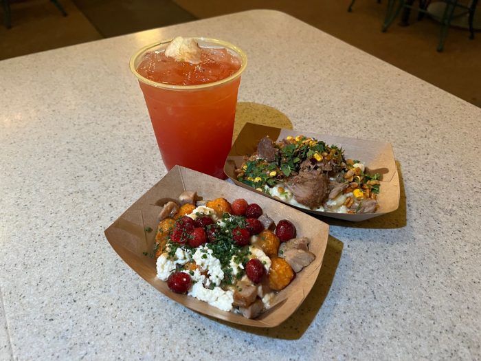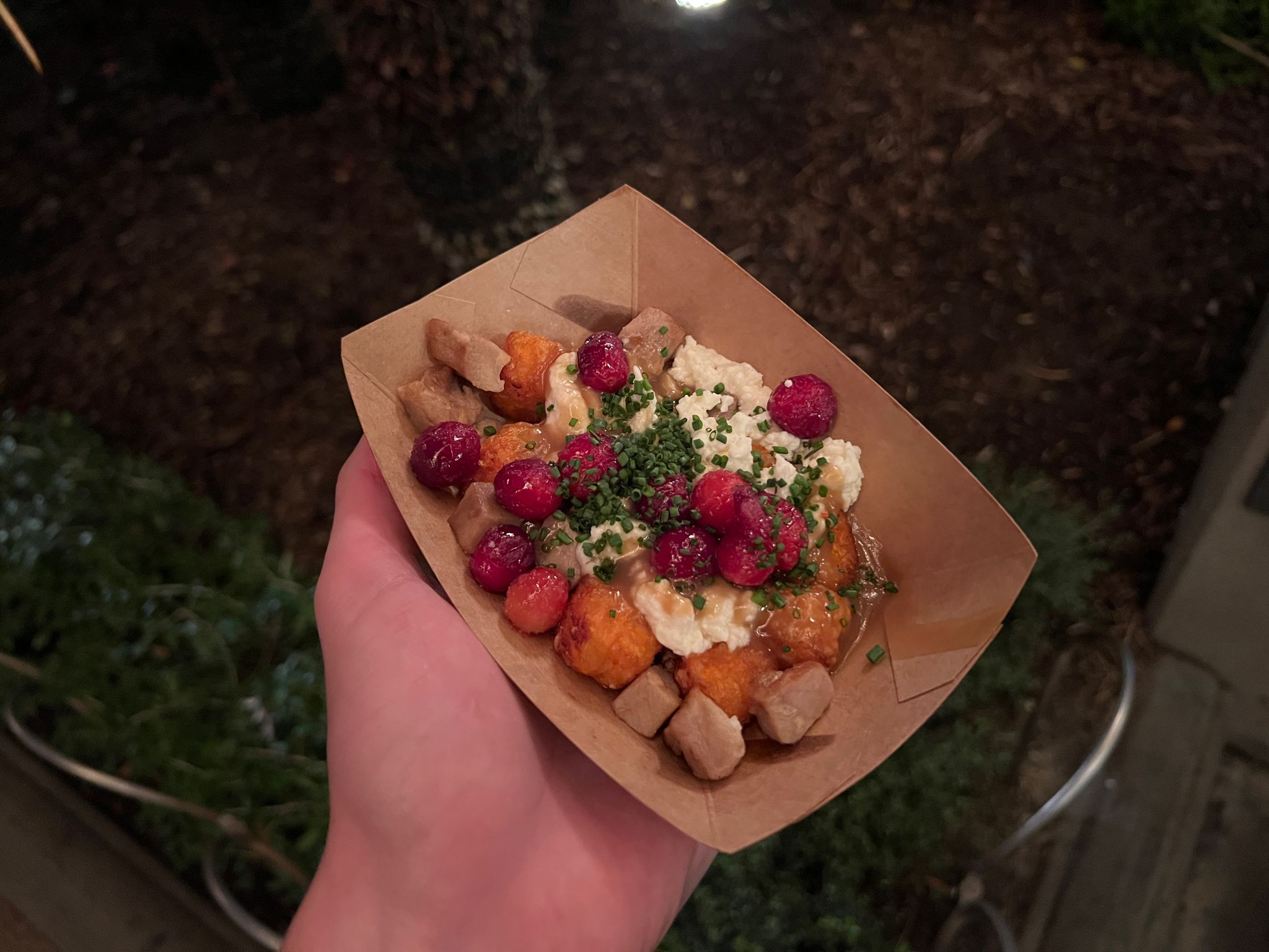 - Turkey Poutine: Layers of Roasted Turkey, Sweet Potato Bites, Cheese Curds and Gravy, topped with Frosted Cranberries — $8.00