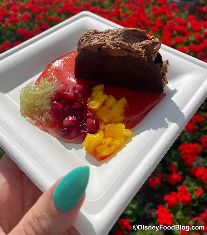 - Taco de Chocolate: Chocolate candy shell filled with Mexican chocolate mousse with a touch of chile topped with seasonal fruit (Gluten/Wheat Friendly) — $6.50, DDP Snack Eligible