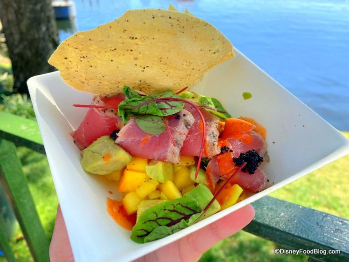 - Tuna Tataki Bowl with spicy yuzu glaze, mango, avocado, and pappadam crisp – $6.25, DDP Snack Eligible